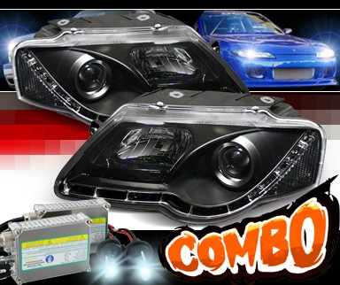 Also, these Volkswagen Passat Sonar DRL LED Black Projector Lamps are equipped with European exotic car inspired LED daytime running lights (also called R8 style DRL's). The strip of super white L.E.D. lights not only add a high-tech look to your Passat's headlamps, but they also provide the added safety benefit of illuminating shady or darkened areas you might come upon during daytime driving. At night, these Sonar Volkswagen Passat Black Day Time Running Light L.E.D. R8 Style Projector Headlights also boost your head lens total light output increasing visibility allowing you to respond faster to obstacles that might come into your path.